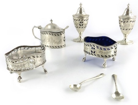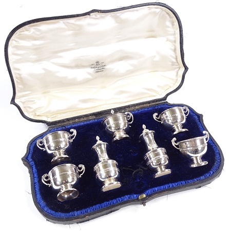 A George V eight piece condiment set, by William Comyns & Sons Ltd., London 1928, comprising: