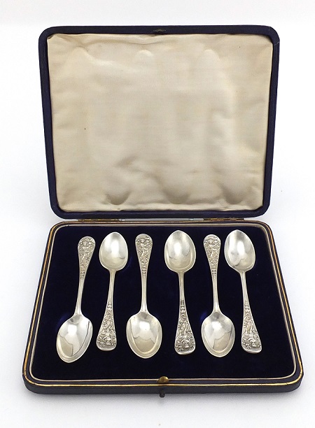 A Set of six Victorian silver teaspoons decorated with a young boy amongst flowers, foliage and C scrolls by William Comyns, London 1898, approximate weight 100.0g, housed in a velvet and silk lined tooled leather box