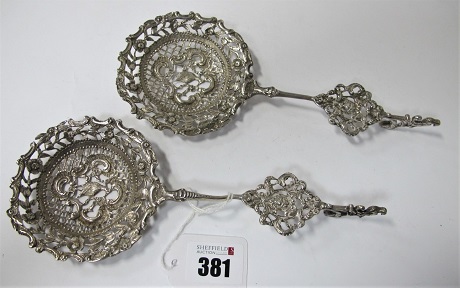A Pair of Decorative Hallmarked Silver Continental Style Openwork Spoons, William Comyns, London 1891, 20.5cm long.