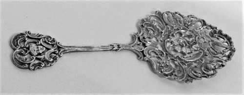 A Victorian pierced silver sifter spoon decorated with cherubs and faces. London 1895. By William Comyns. Approx. 41 grams.