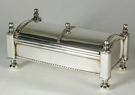 An Edwardian silver ink stand, William Comyns, London 1909, the rectangular casket stand raised on four legs with ball finials, with hinged domed cover opening to reveal three silver topped glass wells, 16cm wide, 7.5cm high, total weighable silver approx 17oz