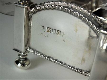 A silver inkstand standing on four scroll feet with a perced gallery and two engraved ink bottles.