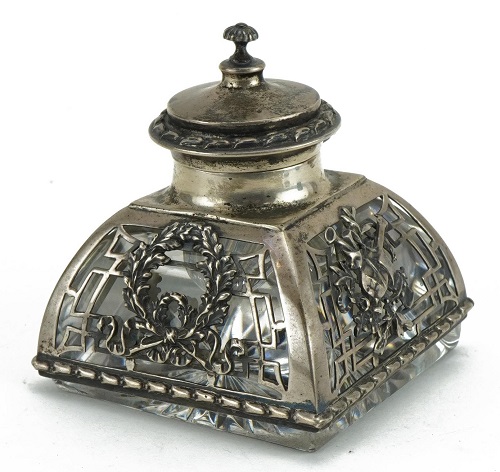 A William Comyns & Sons, Edwardian silver overlaid cut glass inkwell, pierced and embossed with wreaths and musical instruments, London 1904, 7.5cm high