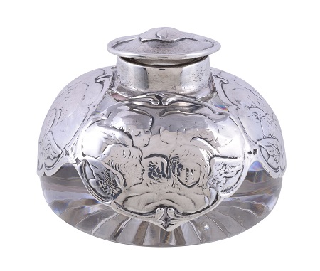 A Victorian Silver and Tortoiseshell Inkwell with a welled and ribbed shaped circular tortoiseshell base applied with an openwork scroll foliate silver band rising to the fixed cut-glass globular inkpot with petal form silver lid, 13.5cm diameter, London 1890.