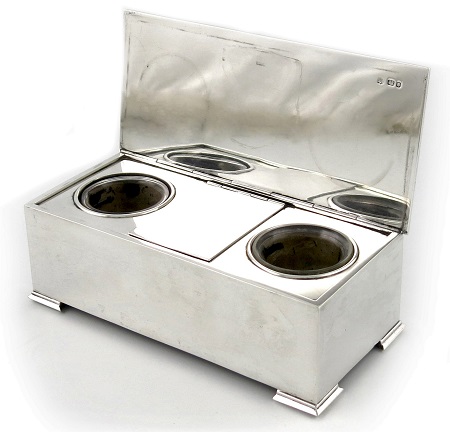 An Edwardian silver ink stand, William Comyns, London 1909, the rectangular casket stand raised on four legs with ball finials, with hinged domed cover opening to reveal three silver topped glass wells, 16cm wide, 7.5cm high, total weighable silver approx 17oz