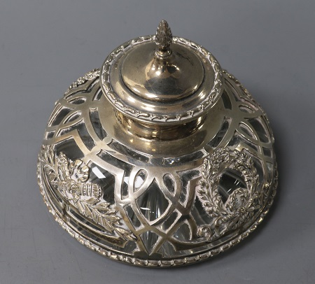 A William Comyns & Sons, Edwardian silver overlaid cut glass inkwell, pierced and embossed with wreaths and musical instruments, London 1904, 7.5cm high