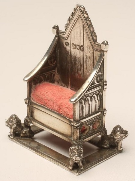 A large novelty pin cushion “Chair” worn blue velvet cover, decorated with lovers, C scrolls and foliage.