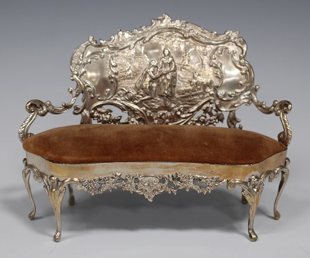 A pin cushion in the formof a chair,the oval back decorated with shells and scrolls and lovers in a landscape scene on cabriole legs and paw feet.