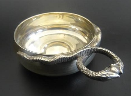 A SILVER SOMMELIER’S “tastevin”with entwined double snake handle, hallmarks for London 1936, maker William Comyns & Sons Ltd, the rim diameter approximately 7.2cm