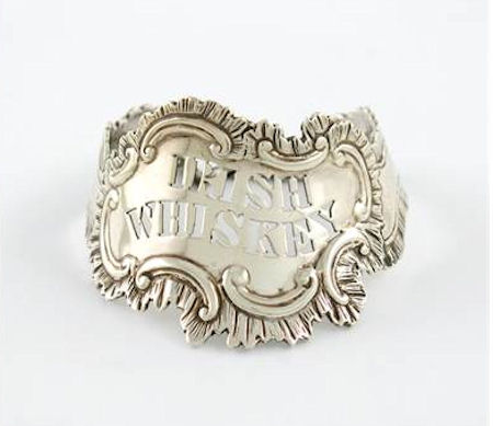A silver wine or bottle label or ticket : IRISH WHISKEY