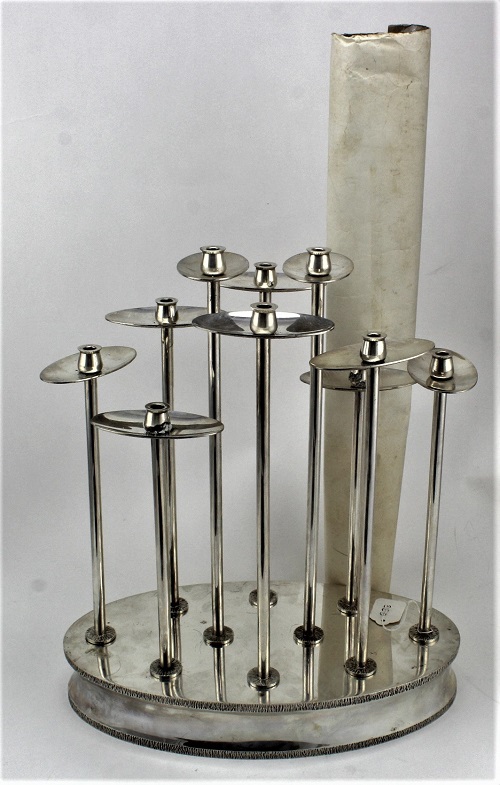 A Silver centrepiece. An exquisite custom designed and made silver centrepiece consisting on ten candlesticks, every component silver hallmarked (including the wingnuts), hallmarked ‘RC, London, 1970 (William Comyns & Sons Ltd)’, engraved to base ‘David C Andrew’, weight 86.5 oz. approx., together with the original hand-drawn designs for the piece.